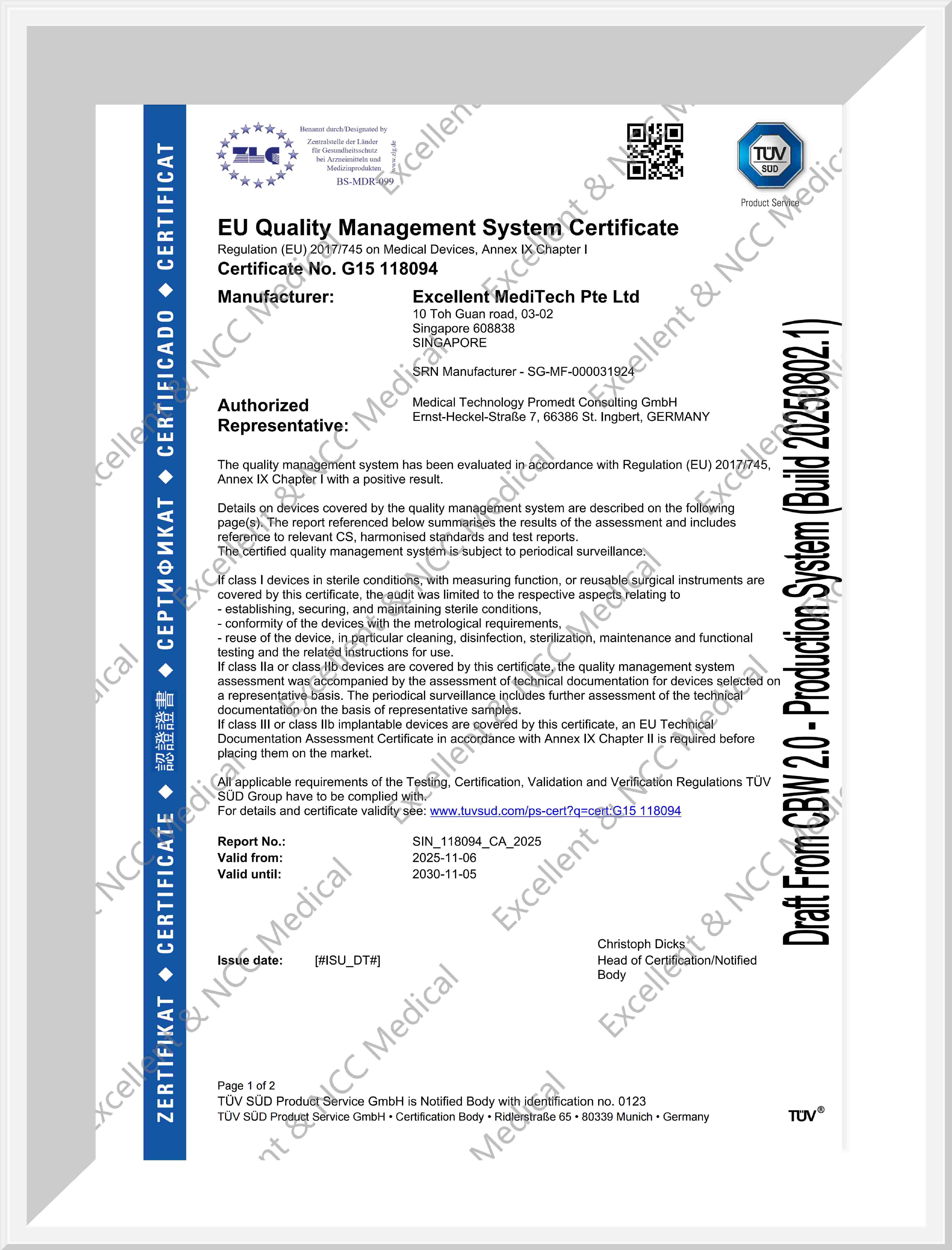 Recently, NCC Singapore achieved a significant milestone: its EEG (Electroencephalography), EMG (Electromyography), and IONM (Intraoperative Neuromonitoring) product lines have successfully obtained the CE MDR Certificate of Conformity (Draft) issued by TÜV Rheinland, certificate number G15 118094 (NCC MEDICAL).